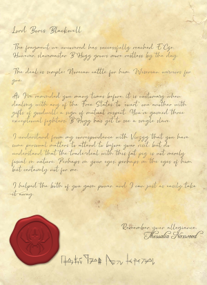 As the rest of the Adventurers go through their loot, Free reads a letter sent to Blackwell from a Thessalia Noxwood. The letter implicates both Blackwell and, to his shock, B'hogg, his former slavemaster, to both be involved in a slave trade. Blackwell kidnapped people who visited his brothels and sold them off to B'hogg, in exchange for soldiers. It is revealed that Noxwood is behind both Blackwell's and B'hogg's rise to power, and that Blackwell was on his way to visit B'hogg. The party draws the conclusion that he has fled to the city-state of E'Cze, one of the Unbound Cities, ruled by B'hogg.